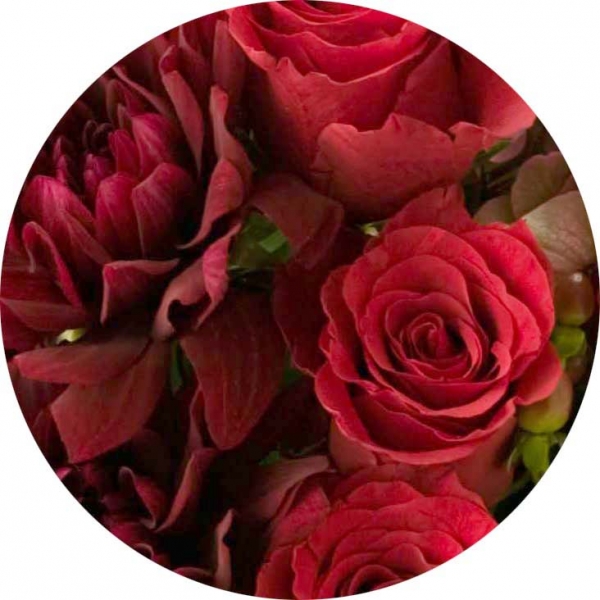 赤いバラとダリアで情熱と品格を表現したアレンジメントです