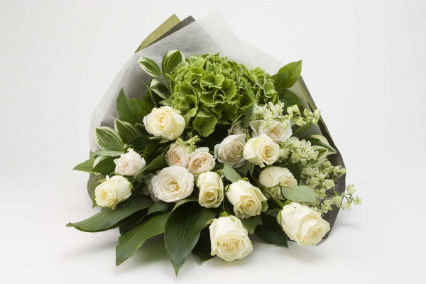 ナチュラルホワイトの薔薇とミントグリーンの紫陽花でまとめたブーケ
