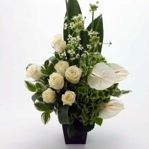 清楚な白薔薇を中心にグリーンをふんだんに使ったナチュラルなアレンジメントです