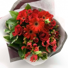 情熱の真紅の薔薇と赤いガーベラ一色の花束です