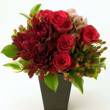 赤いバラとダリアで情熱と品格を表現したアレンジメントです