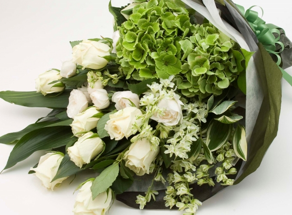 ナチュラルホワイトの薔薇とミントグリーンの紫陽花でまとめたブーケ