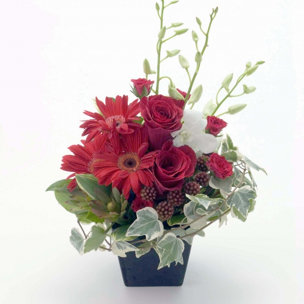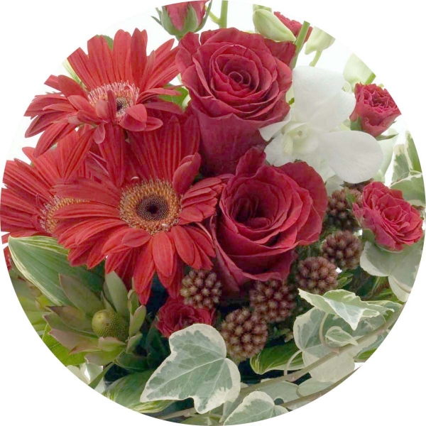 赤いガーベラや薔薇を中心にして葉物と実物をアソートした